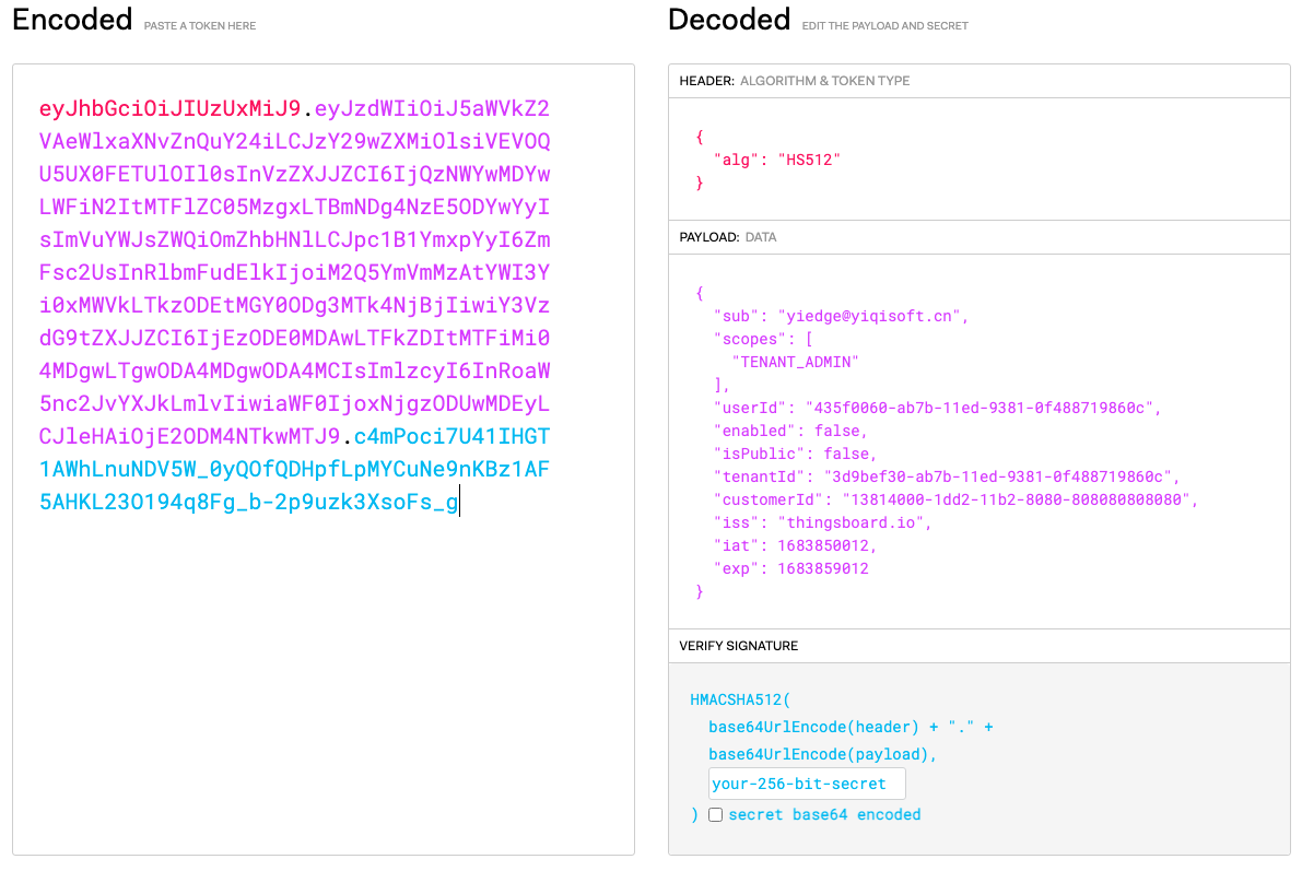 X-Authorization: Bearer eyJhbGciOiJIUzUxMiJ9.eyJzdWIiOiJ5aWVkZ2VAeWlxaXNvZnQuY24iLCJzY29wZXMiOlsiVEVOQU5UX0FETUlOIl0sInVzZXJJZCI6IjQzNWYwMDYwLWFiN2ItMTFlZC05MzgxLTBmNDg4NzE5ODYwYyIsImVuYWJsZWQiOmZhbHNlLCJpc1B1YmxpYyI6ZmFsc2UsInRlbmFudElkIjoiM2Q5YmVmMzAtYWI3Yi0xMWVkLTkzODEtMGY0ODg3MTk4NjBjIiwiY3VzdG9tZXJJZCI6IjEzODE0MDAwLTFkZDItMTFiMi04MDgwLTgwODA4MDgwODA4MCIsImlzcyI6InRoaW5nc2JvYXJkLmlvIiwiaWF0IjoxNjgzODUwMDEyLCJleHAiOjE2ODM4NTkwMTJ9.c4mPoci7U41IHGT1AWhLnuNDV5W_0yQOfQDHpfLpMYCuNe9nKBz1AF5AHKL23O194q8Fg_b-2p9uzk3XsoFs_g